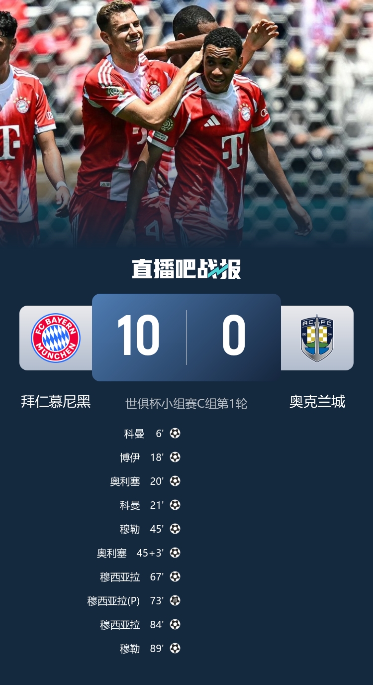 全场比赛结束,拜仁慕尼黑10-0狂胜奥克兰城。