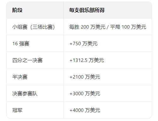 这意味着世俱杯冠军在单届国际赛事中的收入,是超级碗冠军的4倍、NBA总冠军的8倍。而且这还只是决赛的奖金,世俱杯的奖金贯穿全程:小组赛单场胜利200万美元,晋级每个阶段阶段另有重奖,进入四强可以获得2100万美元,晋级决赛就能拿到3000万美元。