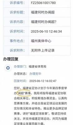 近日,有网友向福建省体育局咨询,福建是否会像"苏超"一样,举行福建省城市足球联赛?6月12日,福建省体育局回复称,福建省足协计划于今年第四季度举办"闽超"赛事。