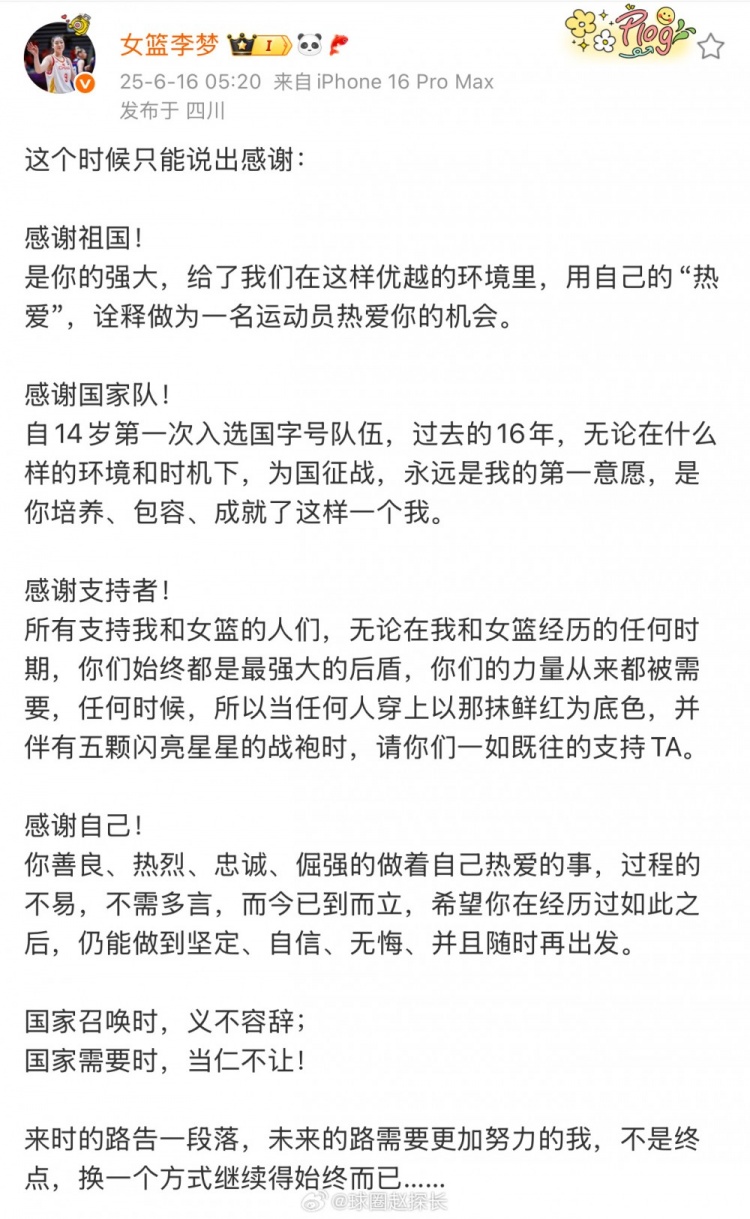 6月16日讯 今天,媒体人@球圈赵探长 在社媒上谈到了李梦将缺席女篮亚洲杯一事。