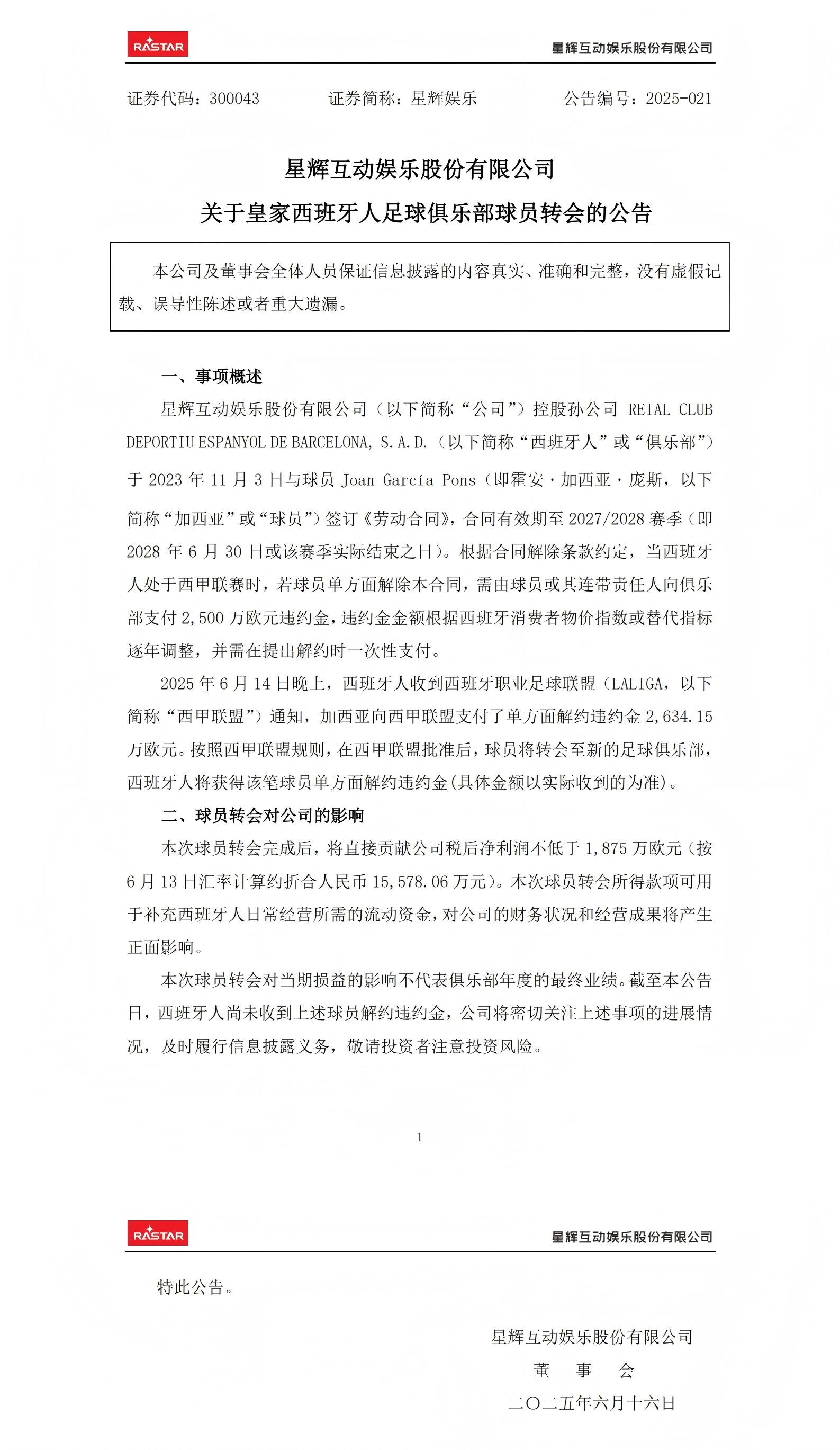 6月16日盘前,A股公司星辉娱乐(300043)公告,控股孙公司西班牙人足球俱乐部球员加西亚单方面支付了违约金。