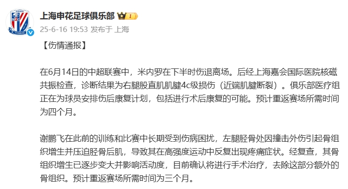 申花官方:米内罗近端肌腱断裂伤缺四个月,谢鹏飞伤缺三个月