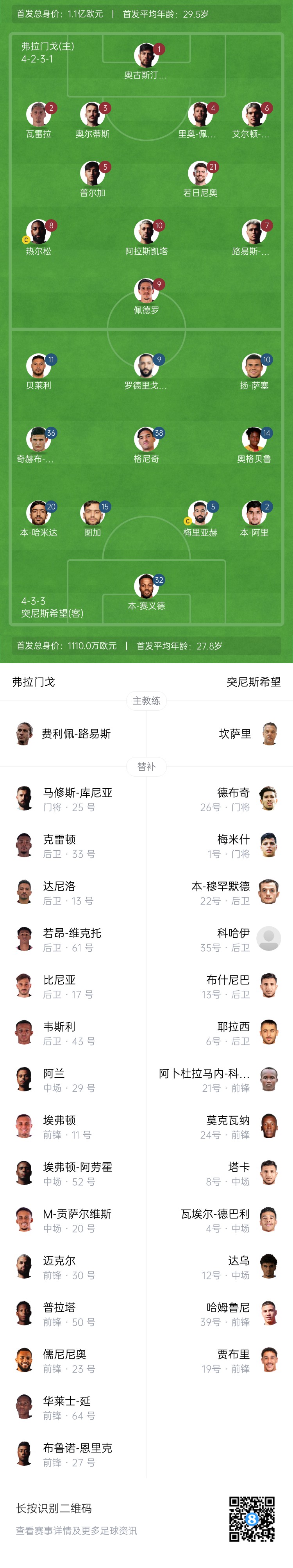 弗拉门戈vs突尼斯希望首发:若日尼奥先发,达尼洛替补待命