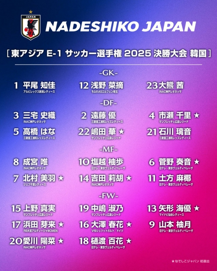 门将:1-平尾知佳(新泻天鹅女足)、12-浅野菜摘(埼玉精灵女足)、23-大熊茜(神户雌狮)