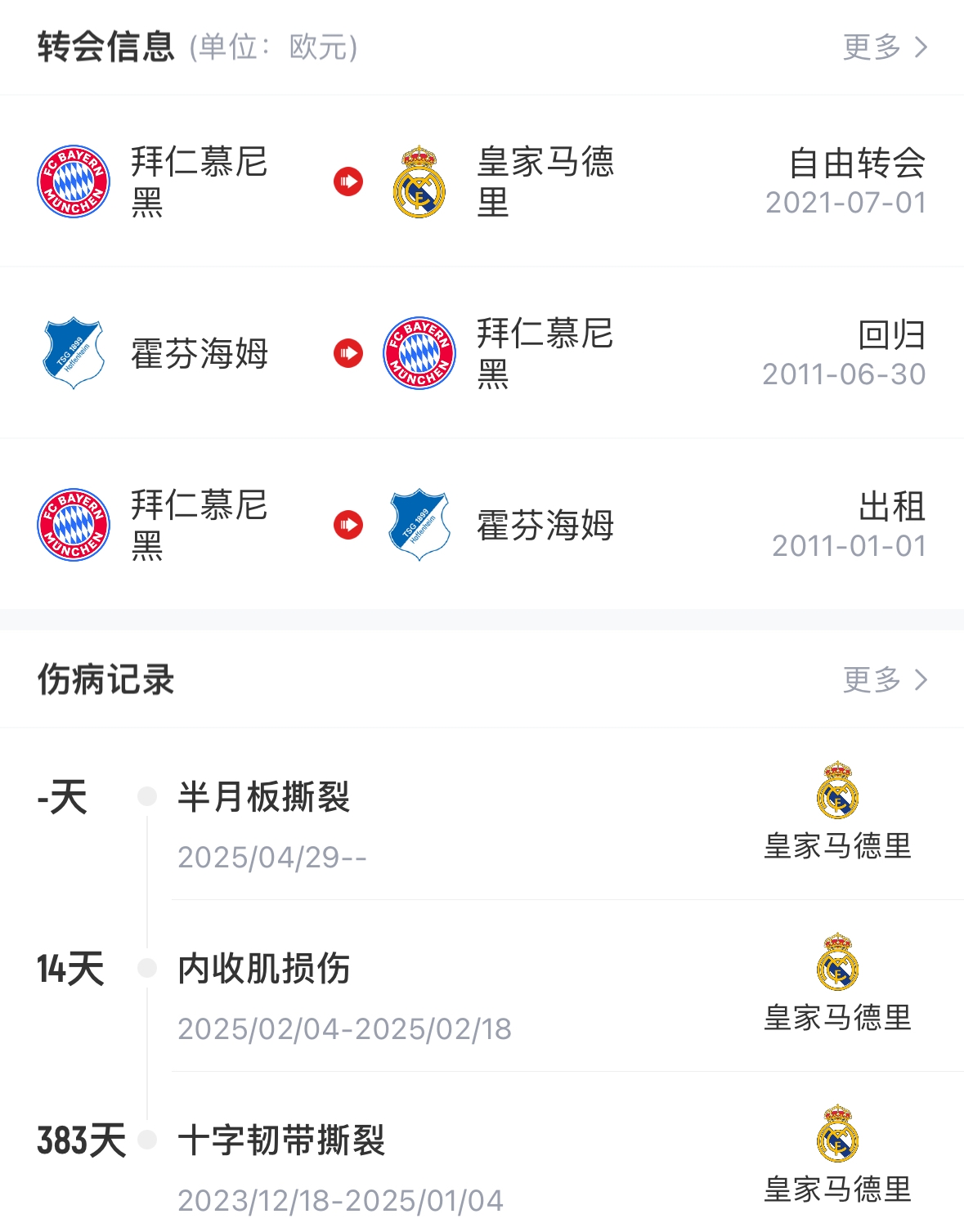 阿拉巴于2021年夏窗从拜仁免签加盟皇马,在23年底,阿拉巴遭遇了十字韧带撕裂,于今年年初才伤愈归来。