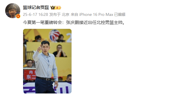 06月17日讯 据篮球记者贾磊报道,今夏CBA第一笔重磅转会诞生,天津男篮主教练张庆鹏接近出任北控男篮主帅。