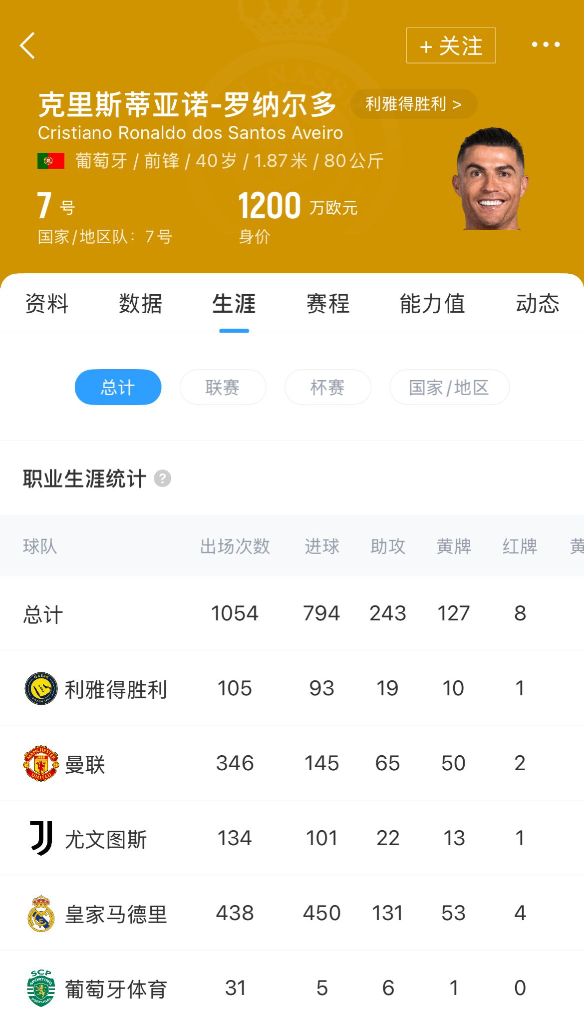 C罗于2023年1月加盟利雅得胜利,至今为球队出战105场贡献93球19助。续约以后,40岁的C罗将继续征战沙特联赛。