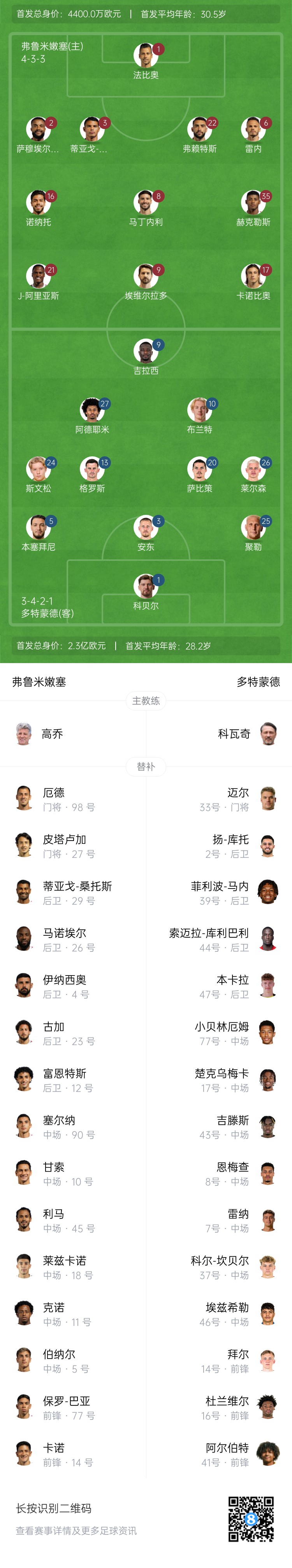 多特vs弗鲁米嫩塞首发:阿德耶米、蒂亚戈-席尔瓦先发 小贝林替补