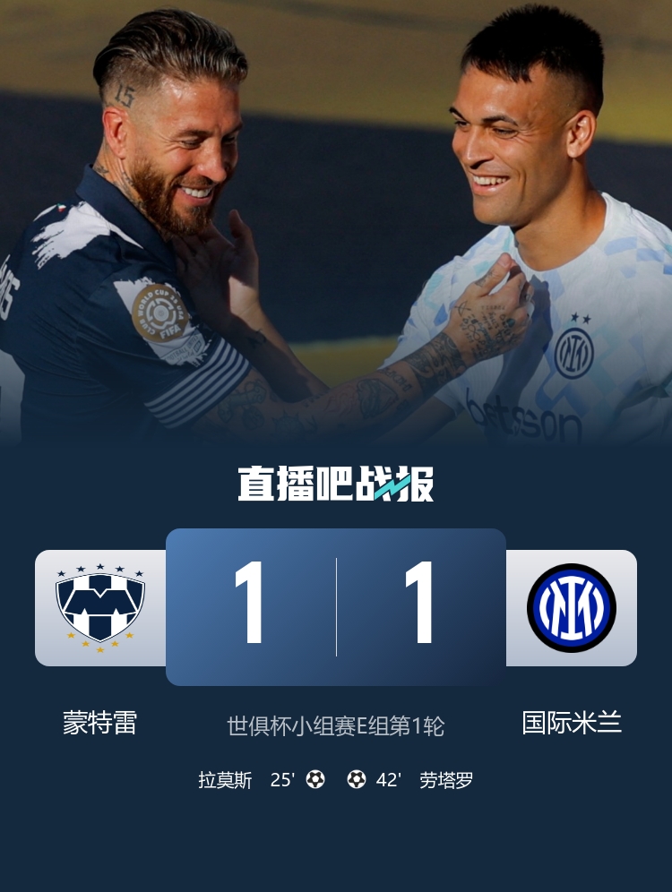 6月18日讯 北京时间9:00,世俱杯小组赛E组第1轮蒙特雷vs国际米兰,比赛在埃克斯普洛里亚球场打响!上半场,拉莫斯角球中力压巴斯托尼头槌破门!奥古斯托助攻劳塔罗扳平!下半场,卡纳莱斯中柱;劳塔罗越位进球被吹。最终,国米1-1战平蒙特雷,新帅齐沃首秀无缘开门红!国米下一场将迎战浦和红钻。