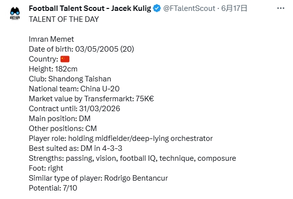 06月18日讯 知名球探网站帖子Football Talent Scout收录了U20国青新星、来自泰山的依木兰,球员模板是本坦库尔。
