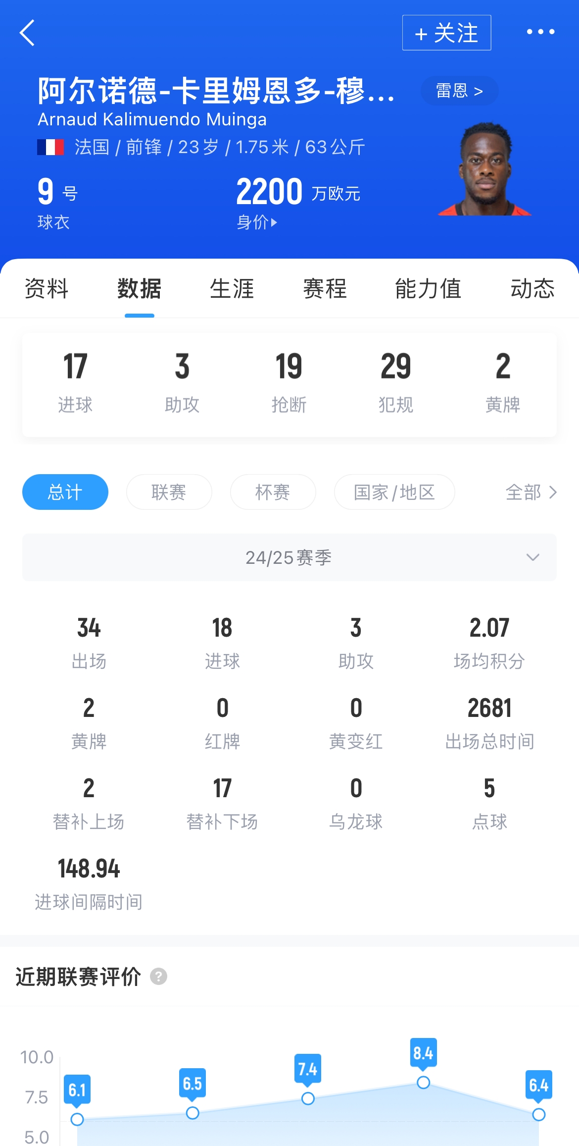 本赛季,卡里姆恩多为雷恩各项赛事出场34场,取得了18粒进球和3次助攻,目前其德转身价已达2200万欧元。