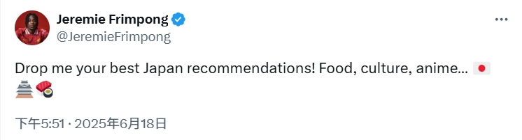 即将日本行!弗林蓬社媒:给我推荐最好的日本美食、文化、动漫