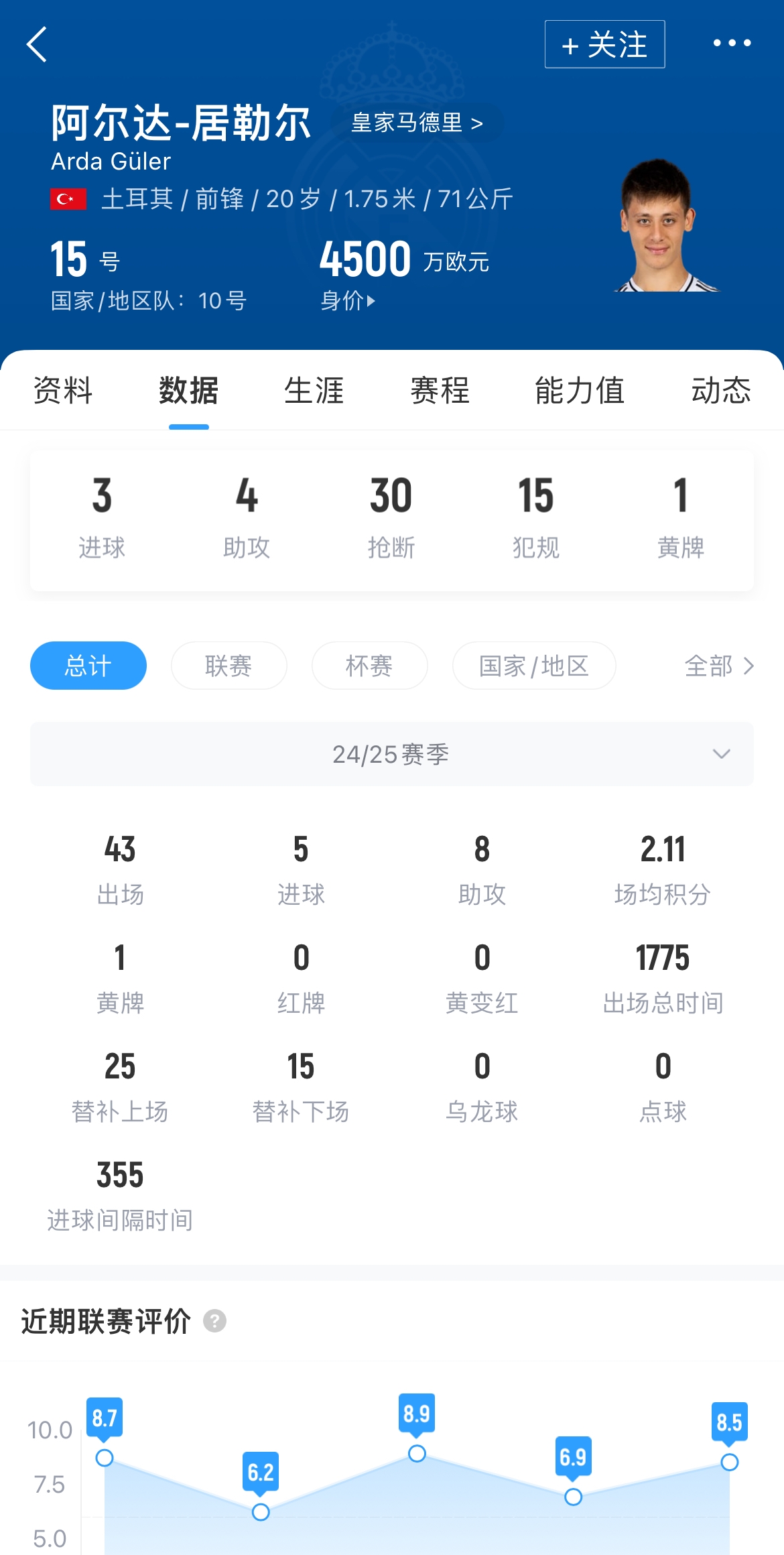 上赛季,居勒尔为皇马各项赛事累计出场43场,其中18次首发出场,为球队取得了5粒进球和8次助攻。