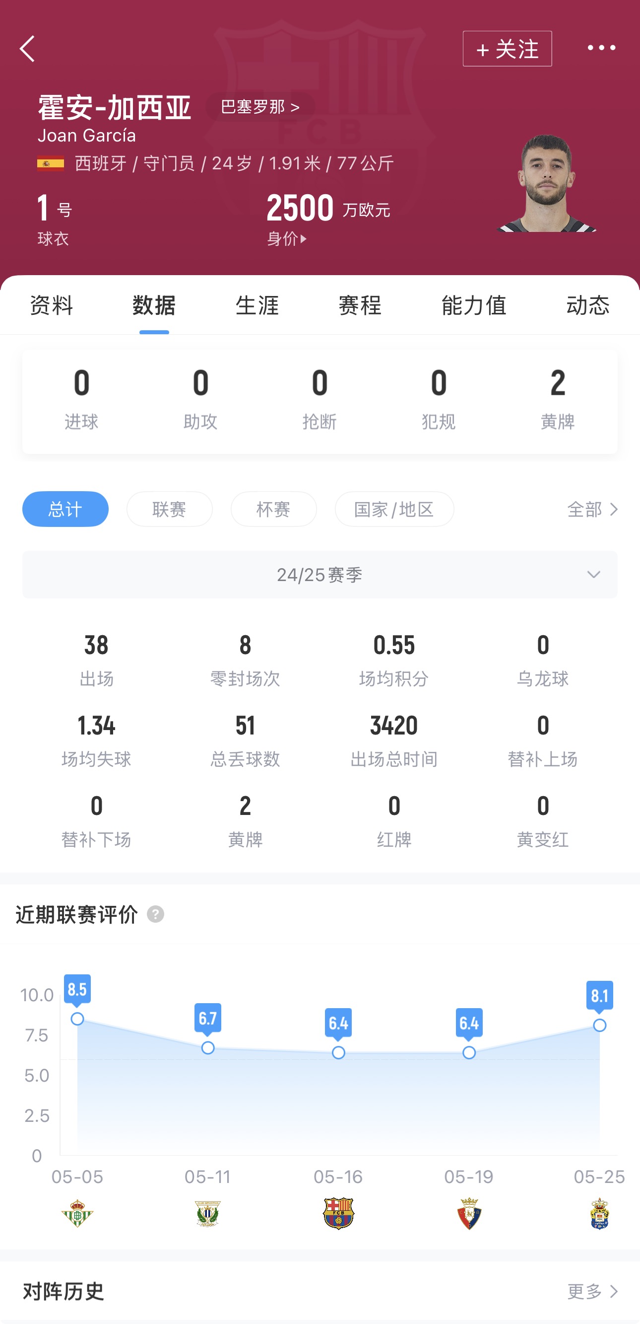现年24岁的霍安-加西亚出自西班牙人青训,德转身价目前是2000万欧元。24/25赛季,霍安-加西亚代表西班牙人出战38场西甲比赛,丢掉51球,完成8次零封。