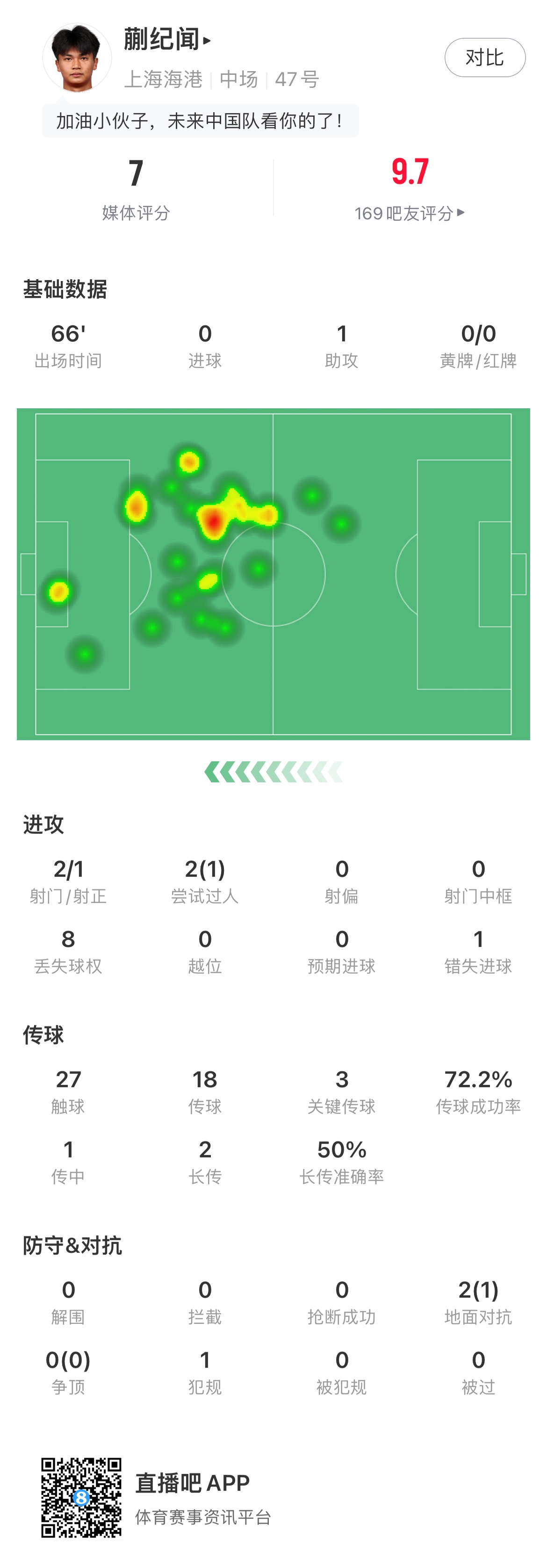 带派不?蒯纪闻本场数据:2射1正1助攻,关键传球3次,评分7