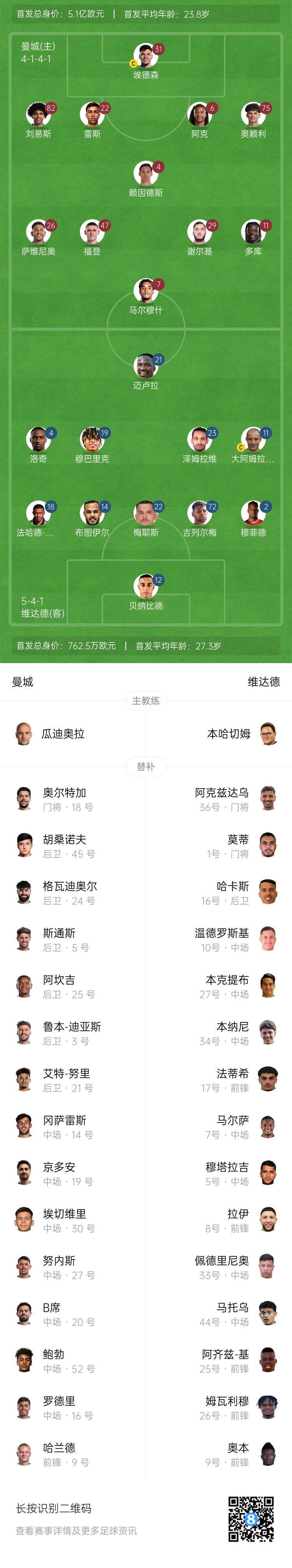 曼城vs维达德首发:谢尔基、赖因德斯首秀,福登出战,哈兰德替补