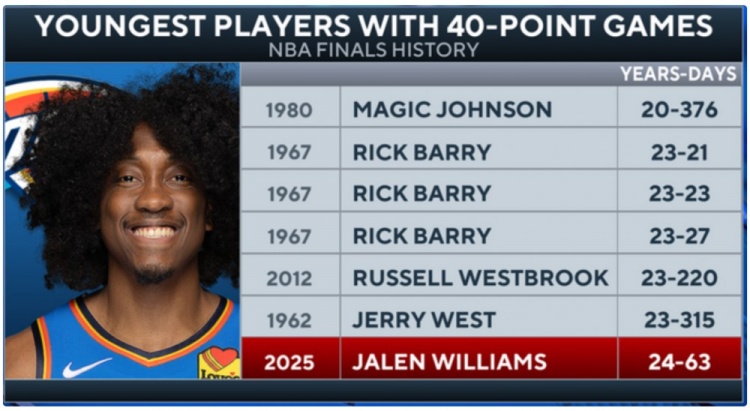 雷霆目前取得系列赛3比2领先,第六场将移师印第安纳。对于所有球迷尤其是24岁的杰伦-威廉姆斯而言,这轮总决系列赛都非常精彩。杰伦-威廉姆斯已成为NBA历史上第五位在25岁前连续三场总决赛得分超过25分的球员,此前达成此成就的仅有欧文、杜兰特、奥尼尔和韦德。在这篮球界最伟大的舞台上,杰伦-威廉姆斯正与那些史上最伟大的球星比肩而立。