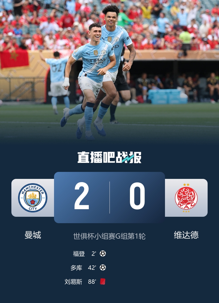 6月19日讯 北京时间6月19日凌晨0:00,世俱杯小组赛G组第一轮,曼城对阵摩洛哥球队维达德,比赛在美国费城林肯金融球场进行。上半场福登闪击,随后通过角球机会助攻多库再下一城,曼城暂2-0维达德;下半场两队均未改写比分,里科-刘易斯直红,最终曼城2-0维达德取开门红。