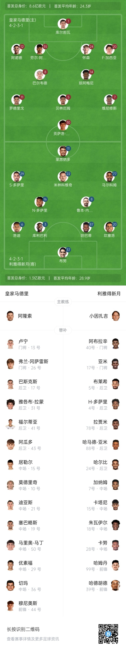 皇马首发:1-库尔图瓦、20-弗兰-加西亚、24-怀森、35-劳尔-阿森西奥、12-阿诺德、5-贝林厄姆、8-巴尔韦德、14-琼阿梅尼、7-维尼修斯、11-罗德里戈、30-贡萨洛-加西亚