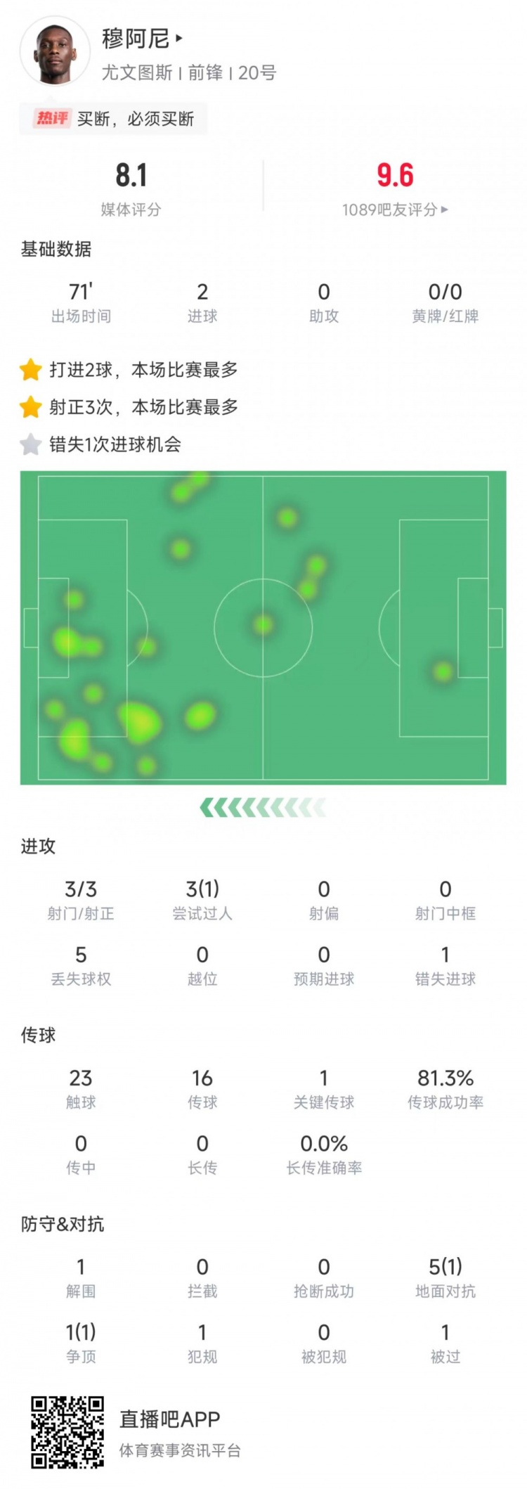71分钟3次射正进2球!穆阿尼当选尤文5-0艾因全场最佳
