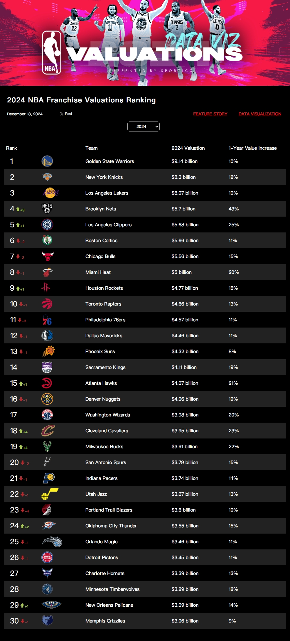 去年底,知名美媒Sportico发布了2024年NBA30支球队的市值报告,数据显示,目前NBA球队的平均市值约为46亿美元,总价值比相较2023年上涨了15%,几乎是四年前的两倍,当时的平均市值约为23.7亿美元,哪些球队市值疯狂飙升呢?今天老震来盘点一下(市值单位均为美元,括号内为24年对比23年排名变动,-代表下降,+代表上升,未标明则代表排名不变)。