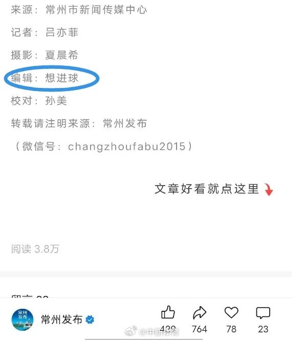 在常州发布6月17日发布的《常州VS南京!主场开票时间定了》中,小编的署名是“进球”。6月18日,在常州发布《“苏超”常州主场,72小时极速攻坚!》中,小编又改名为“想进球”。