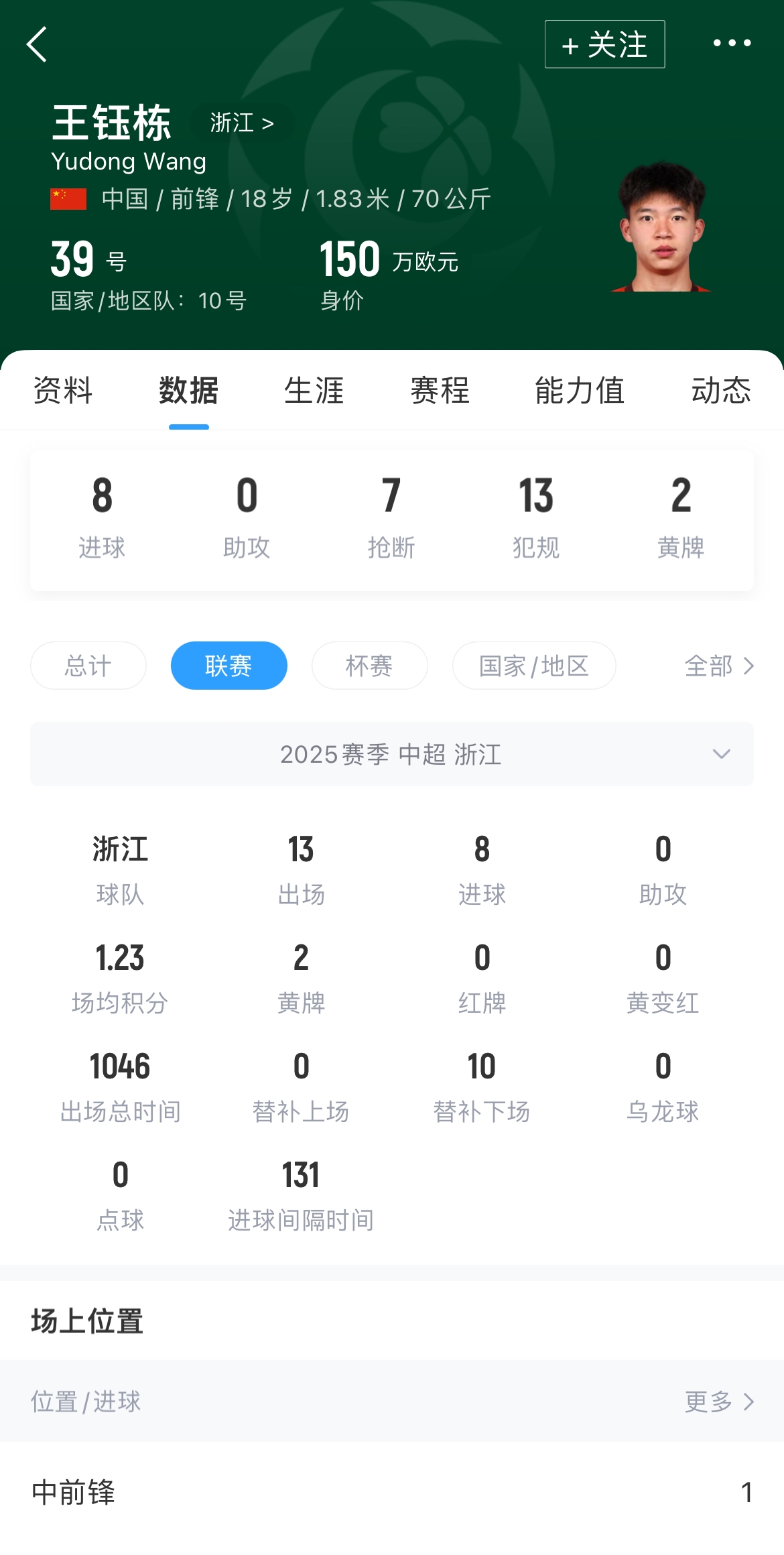 本赛季,王钰栋为浙江队联赛出场13场,取得了8粒进球。