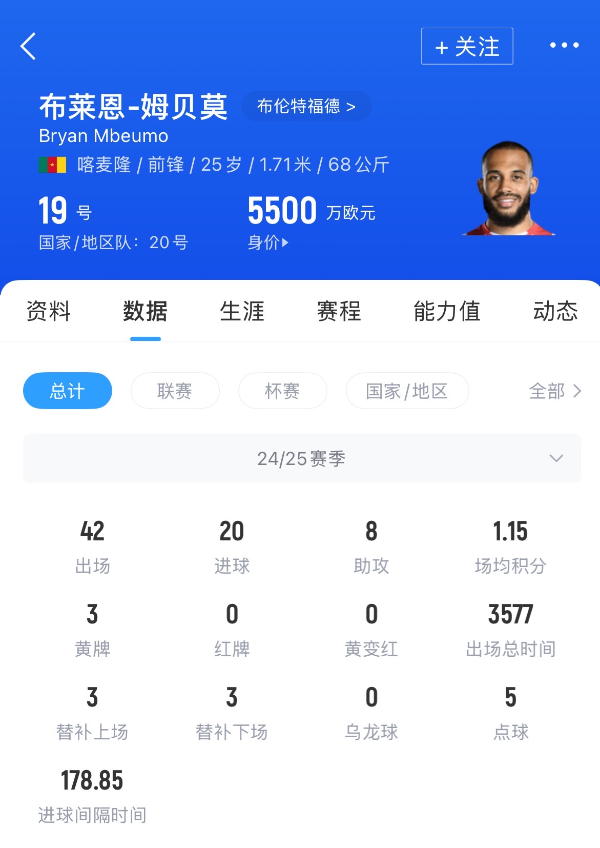 现年25岁的喀麦隆前锋姆贝莫,本赛季代表布伦特福德在各项赛事中出场42次,打进20球,贡献8次助攻。他与俱乐部的合同明年夏天到期,目前德转身价5500万欧元。