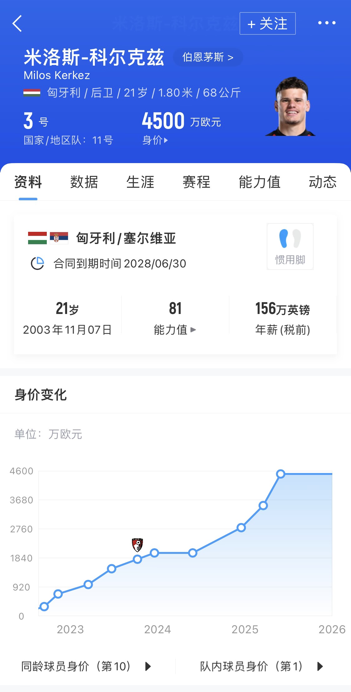 科尔克兹现年21岁,匈牙利国脚,司职左后卫,最新身价为4500万欧,曾效力过阿尔克马尔,2023年夏窗加盟伯恩茅斯,上赛季各项赛事出场41次,并展现出防守之外的进攻实力,打入2球并有5次助攻。