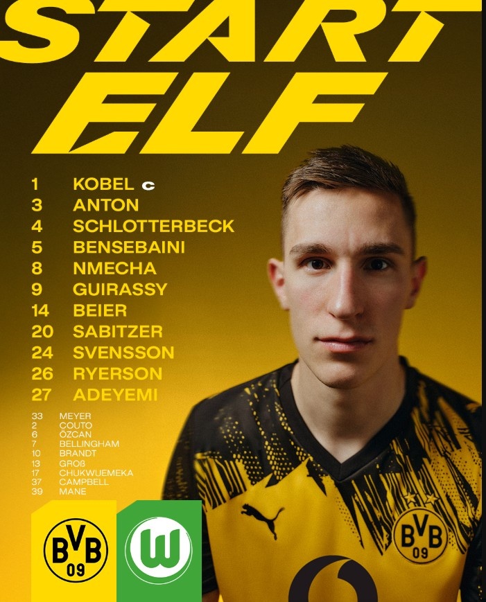 9月22日讯 德甲第4轮比赛,多特在主场迎战沃尔夫斯堡。目前,多特已经公布了本场比赛的首发名单,施洛特贝克复出,吉拉西、阿德耶米出战。