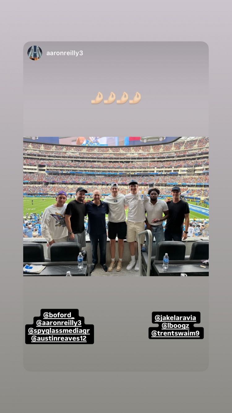拉拉维亚晒出自己和里夫斯等人一起现场看NFL洛杉矶闪电比赛的照片。