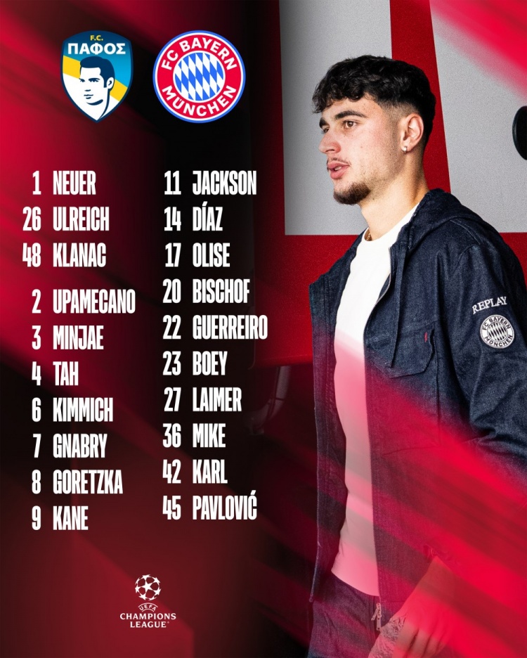 拜仁欧冠客战帕福斯大名单:凯恩领衔锋线,比朔夫、格雷罗在列