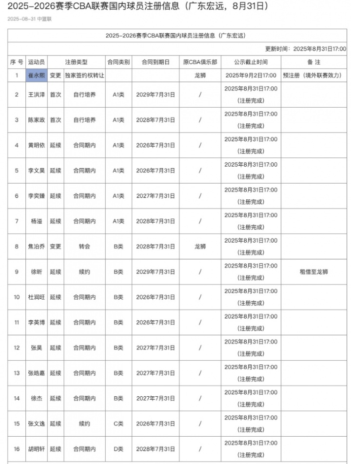 08月31日讯 CBA官网今天更新了国内球员注册信息,广东为崔永熙完成预注册。