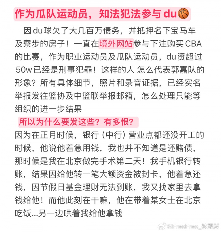 9日晚19点,“@FreeFree_被耍版”再次发出相关记录举报徐杰疑似参与赌球,爆料其一直在境外网站参与下注购买CBA的比赛,并因此欠下大几百万债务,同时还抵押了名下的宝马车及房子。并且已将证据发往篮协进行实名举报。