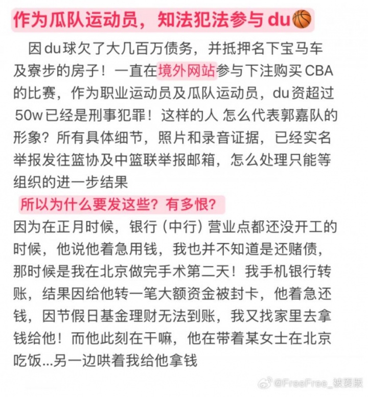 08月10日讯 微博网友“@FreeFree_被耍版”发布长文、晒出聊天记录,爆料中国男篮&广东后卫徐杰YP、出轨、劈腿、多次致人打胎,甚至赌球欠数百万赌债,已抵押名下车房。