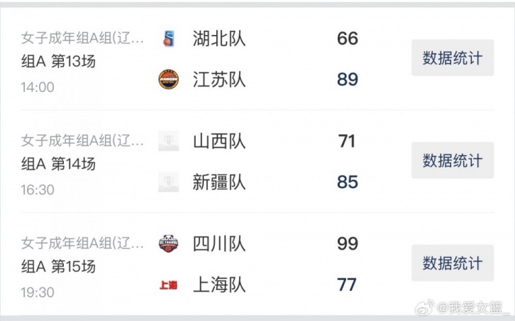 江苏队89-66湖北队,许晨妍独得24分7篮板,罗欣棫15分5篮板,马文13分。湖北队刘贝得到17分,彭华倩、高建军各11分。