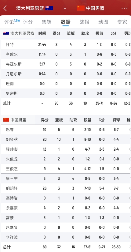 本场比赛,中国男篮全队罚球30中26,命中率为86.7%。