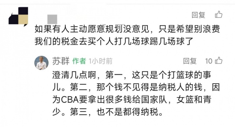 苏群:“澄清几点啊,第一,这只是个打篮球的事儿。第二,那个钱不见得是纳税人的钱,因为CBA要拿出很多钱给国家队,女篮和青少。第三,也不是都得纳税。”
