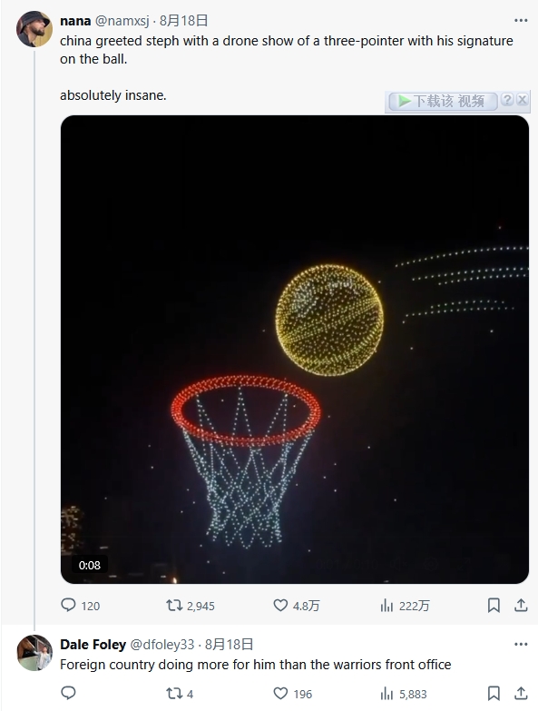 重庆无人机表演库里三分!美网友:外国人为库里付出得都比勇管多