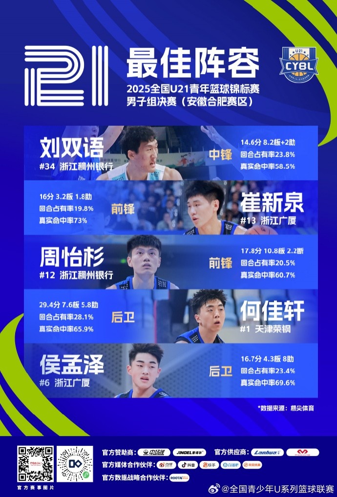 全国U21青年篮球锦标赛最佳阵容公布!五位球员以稳定输出与高效数据,组成本届赛事的梦之阵容:中锋刘双语 浙江稠州银行14...