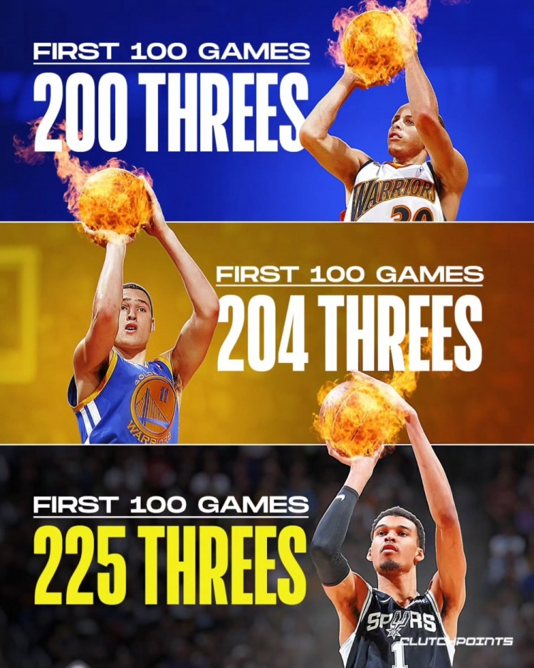 文班生涯前100场三分命中数为225!高于水花各自前100场命中数!