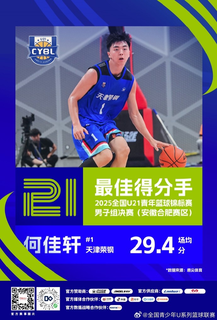 全国U21青年篮球锦标最佳得分手:何佳轩 最佳抢断手:杨溢