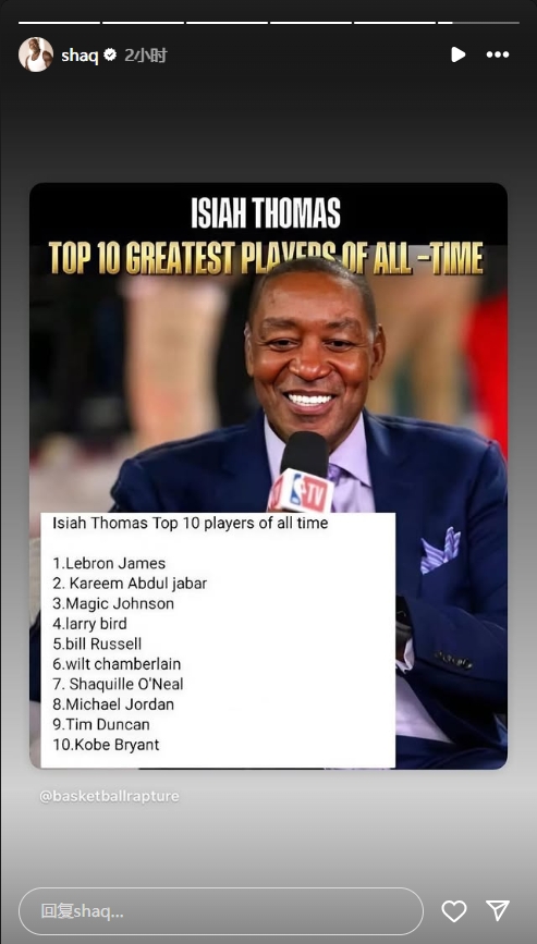 微笑刺客排历史前十:詹姆斯第一&乔丹仅第八!奥尼尔转发