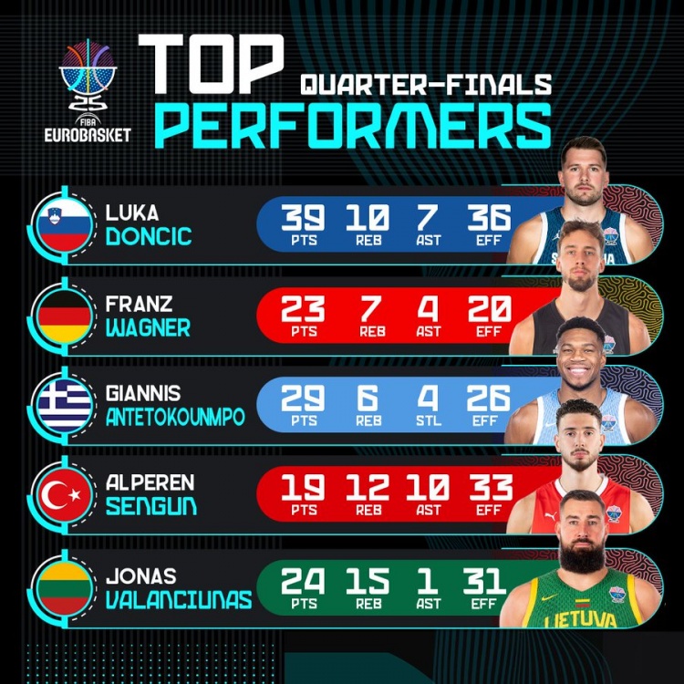 欧锦赛官推晒8强战球员高光:东契奇39+10+7 字母哥29分 申京三双