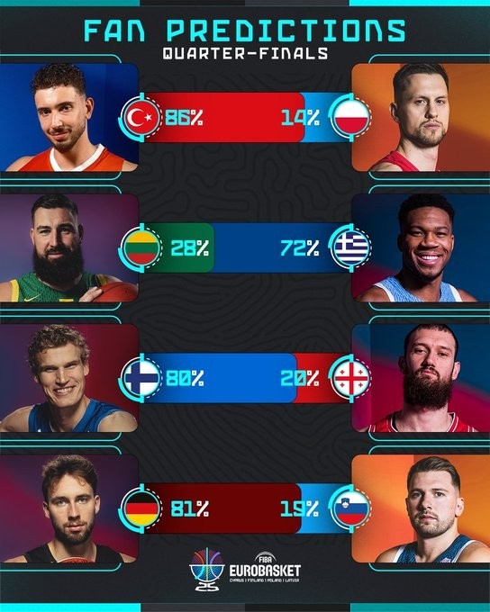 欧锦赛官方发布1/4决赛球迷预测结果,具体如下:土耳其86% 波兰14%立陶宛28% 希腊72%芬兰80% 格鲁吉亚20...