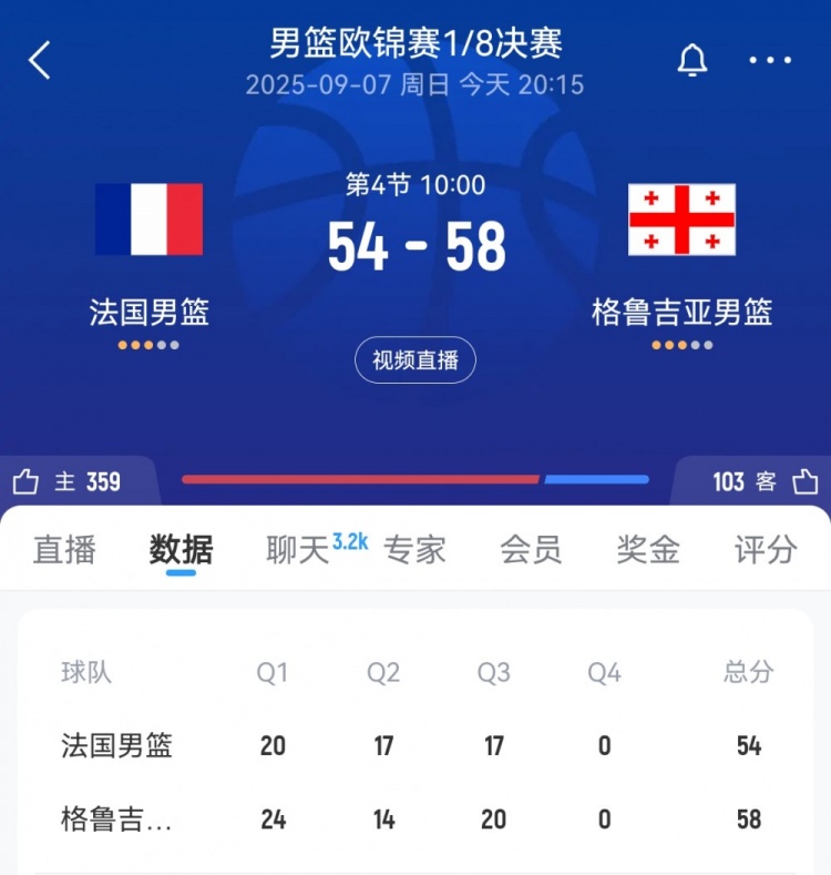 又要爆冷?三节打完格鲁吉亚男篮58-54领先法国男篮4分