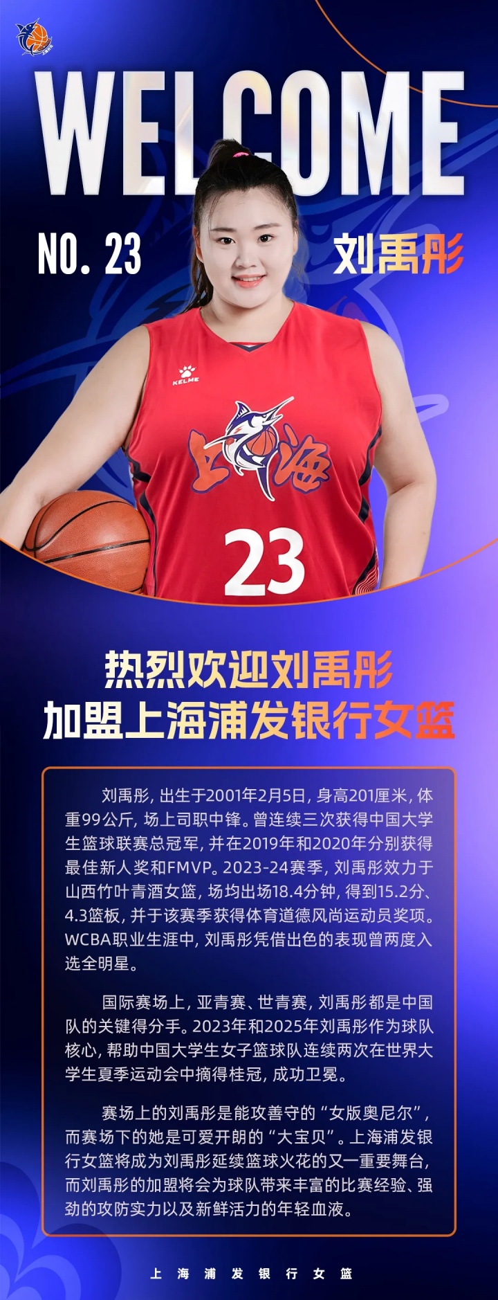 官方:“大宝贝”刘禹彤加盟上海浦发银行女篮