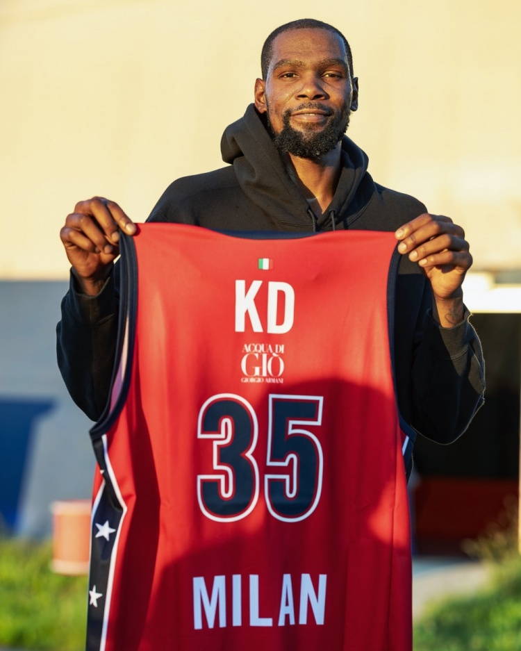 杜兰特造访米兰阿玛尼获赠球衣!主队:我们球衣颜色很适合你