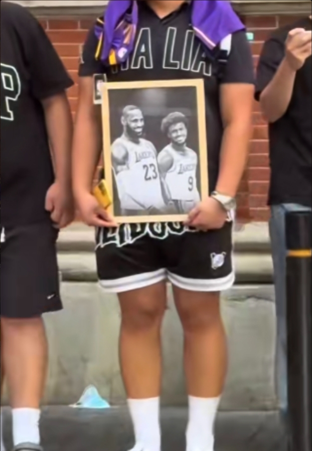 球迷手持詹姆斯和布朗尼的黑白画框合照在外滩等待