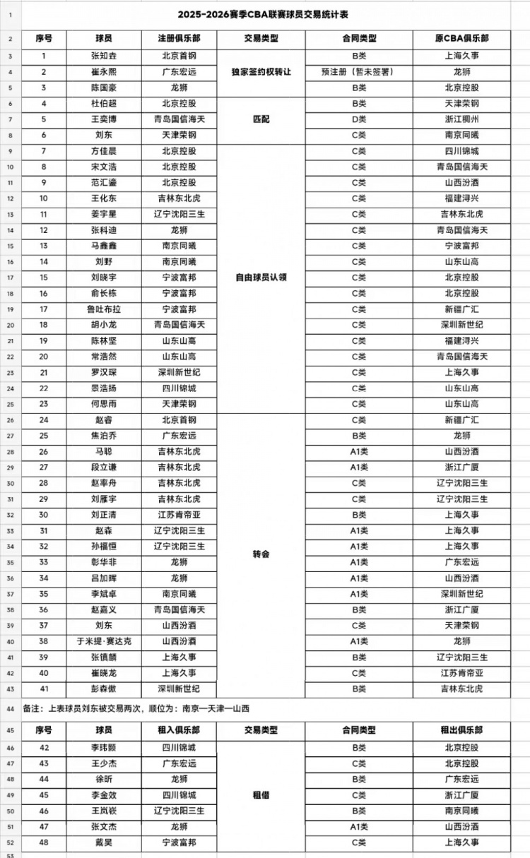 国内球员交易48人次,其中转会18人次,自由球员认领17人次,匹配签约3人次,独家签约权转让3人次,租借7人次。这是过去...